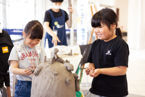 粘土でできた大きな狛犬に飾り付けをします。作品のお持ち帰りはできません。